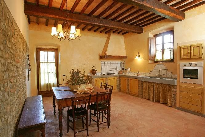 Piękna transformacja stylu wiejskiego, na bardziej elegancki. Kamień na ścianach, ogromne okapy, surowe drewno. Sprawiają wrażenie śródziemnomorskiej wiejskiej rezydencji. Kolory powinny być ciepłe, najlepiej w kolorze ziemi. W kwestii dodatków warto postawić na antyki i kwiaty.